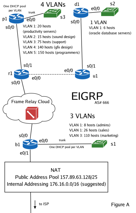 Activision (stock ticker: ATVI), a video game company has just announced that they will create a game based on the story of Shrek 2, and have hired you to design and implement a network for a newly created game development group. You have created and initial network topology (as shown in figure A). After considering the pros and cons you have decided to use EIGRP as you internal routing protocol (please use AS# 666 for the purpose of this case study).