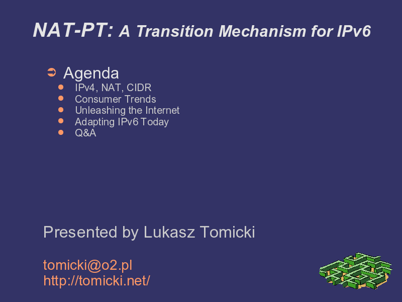 In today’s presentation I will tell you a bit about IPv6, the reason you might considers using v6, a number of simple transition scenarios, and finally the usage of NAT-PT as part of your transition strategy.