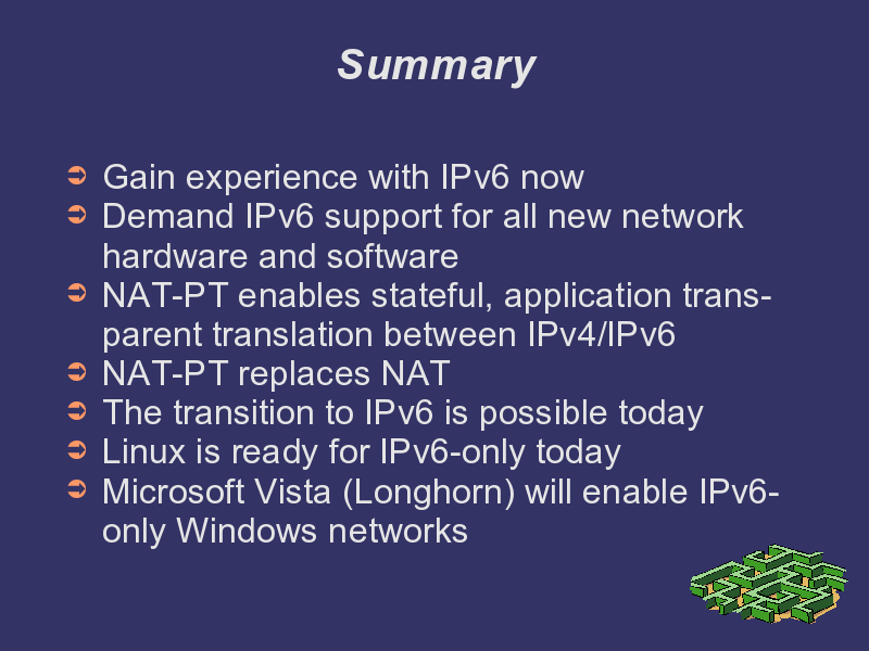 Regardless of whether you wish to be an early adopter or not, you should think about IPv6 today and plan for a transition now. Developing a comprehensive transition strategy and carrying it out during the next upgrade cycle in our organization will help make the move less painful. With NAT-PT, DNS proxies building robust IPv6-only networks is possible today. Demand support for IPv6 for all new hardware and software.
