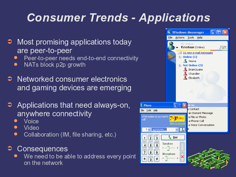I’ve already told you, that P2P will be an important part of the Internet of the future, applications for voice, video and collaboration (Instant Messaging, file sharing, etc.) are already amongst the most popular. Less obvious things like connectivity to your home appliances are bound to emerge. When the usage of RFIDs by retailers will become widespread, a intelligent refrigerator will be able to tell you exactly what products it has stored, how fresh they are, etc. While shopping at the supermarket, you’ll be able to easily connect from your cellphone to your home appliances, and check if you have enough milk for the next week, or if you have all the ingredients needed for the dish you wish to make this evening. This may all sound like Sci-Fi, but these things are coming, and once the network becomes omnipresent, we will find that all these things are possible and the technology to deliver all these solutions is already here.