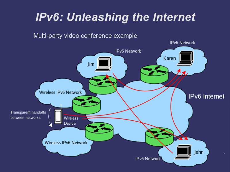 The example above shows a multi party video-conference which today is also possible, but requires a lot of haste with NATs, traffic queuing and others. With IPv6, everyone is globally reachable, mobile users can maintain their mobility while engaged in the conference. Simply put, a more robust and flexible Internet, without a NATs that block peer to peer communication.