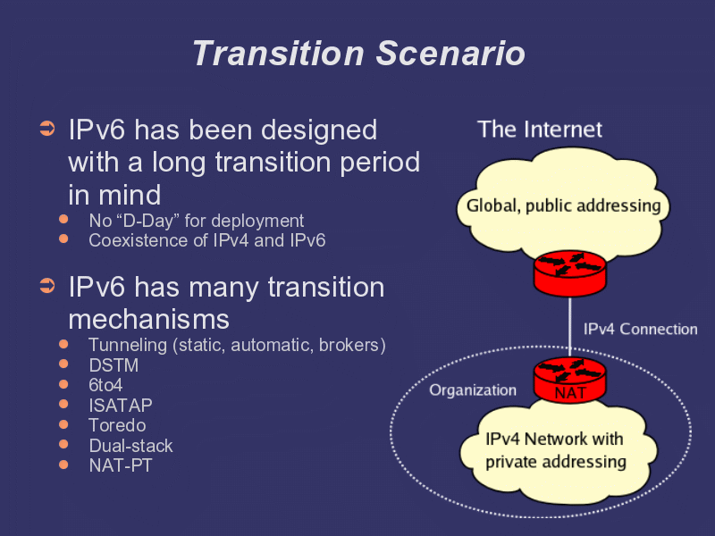 The applicability of the different transition strategies varies, but today’s presentation concentrates on NAT-PT, a mechanism that allows you to move your networks to IPv6 and start taking advantage of it while maintaining the ability to communicate with the rest of the IPv4 world. NAT-PT has been designed to minimize the administrative burden of moving to IPv6. It allows you to drop IPv4 from your internal network completely and focus on using IPv6. In IPv6 to IPv4 communications all your traffic passes through NAT-PT, which it is still a NAT with all the evils it brings, but if you have been using one all along then you are used it. On the other hand you now have IPv6 connectivity and are on your way to abolishing NAT completely.